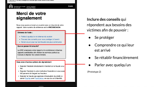 En soumettant des éléments tangibles aux gens qui ont été touchés par la cybercriminalité ou la fraude, nous serons en mesure de savoir ce dont ils ont besoin et d’ajuster nos prototypes pour répondre à un plus grand nombre de ces besoins.