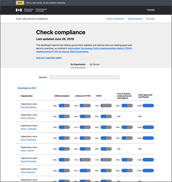 Track web security compliance is an open source application in the public domain adapted by the Canadian Digital Service from 18F’s project Pulse.